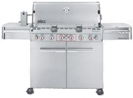 Weber Summit S-670, stainless steel, liquid propane gas grill, with tuck-away rotisserie motor, features a stainless steel enclosed cart with chrome plated cast aluminum handles, 60,000 BTU main burner & 6 stainless steel burners, 12,000 BTU flush mounted side burner, 10,600 BTU infrared rear mounted rotisserie burner, 10,600 sear burner, 8,000 BTU smoker burner & smoker box, snap-jet ignition system, grills are accent colored painted steel frame, stainless shroud with polished handle & trim, accent-colored cast-aluminum end caps, 2 stainless steel work surfaces, accent-colored painted steel frame, lighted control knobs, 6 tool hooks, 2 handle lights, enclosed tank storage area, includes Weber cookbook, limited warranty,and 10-feet flexible hose. Item comes with 6 Stainless Steel burners and a side burner.Buy Weber 7470001 Summit S-670 Natural Gas Grill, Stainless Steel
